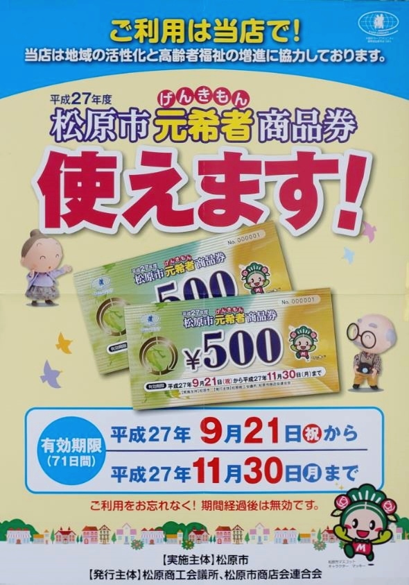 松原市元希者商品券 2015年9月21日元希者商品券磯野 『松原市元希者商品券』は、平成27年11月30日(月)をもって利用期間が終了しました。 商店会加盟店でのご利用ありがとうございました。 松原市元希者商品券のご利用はこのポスター・のぼりのあるお店で 松原市広報平成27年9月号