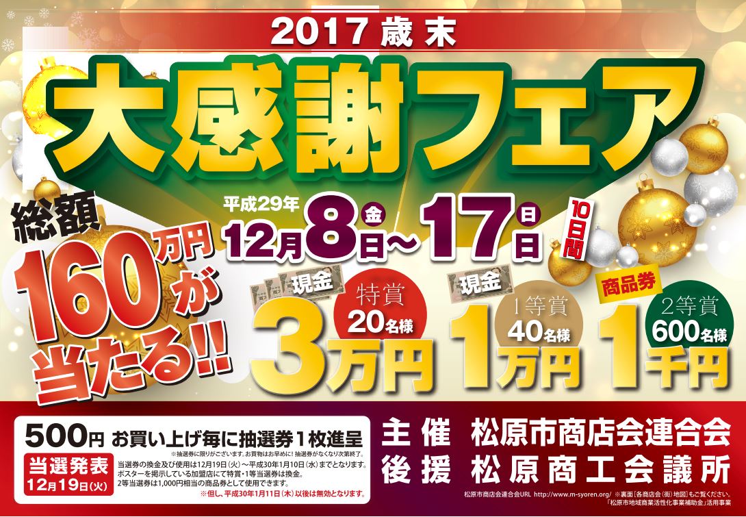 2017歳末大感謝フェア 2017年12月7日大感謝フェア磯野 平素より松原市商連加盟店のご利用ありがとうございます。 松原市商連では、平成29年歳末大感謝フェアを開催します。 期間中の商連加盟店でのお買い物をお願いします。 特 賞;3万円(20名様) 1等賞;1万円(40名様) 2等賞;千円(600名様) ・期間;平成29年12月8日(金)~ 12月17日(日) ・平成29年12月19日(火)に当選番号を店頭発表 ・平成30年1月10日(水)までに当選番号券をご利用・換金ください 松原市商店会連合会 歳末大感謝フェア 2017